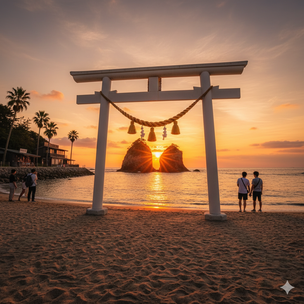 하얀 도리이(鳥居)와 바다 한가운데 우뚝 솟은 두 개의 바위 '메오토이와(夫婦岩, 부부 바위)'가 인상적인 장소입니다.